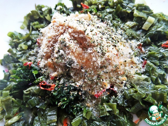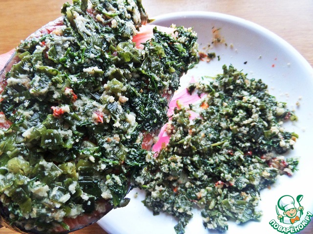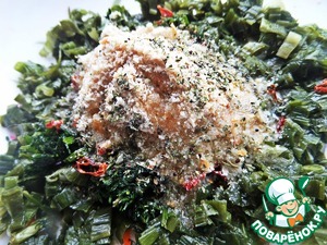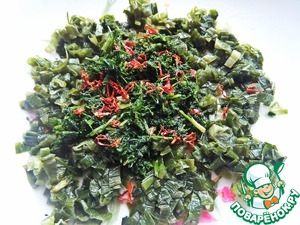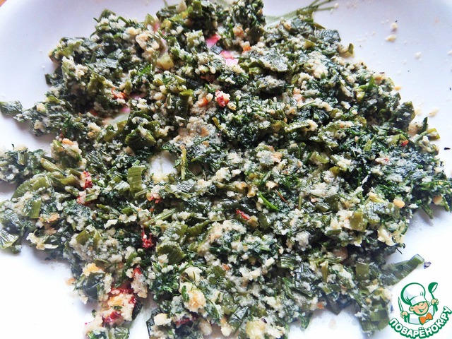 Готовим зелёную "шубку": смешать петрушку и лук (у меня размороженные, нужно было использовать)+чили.