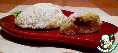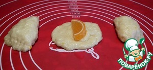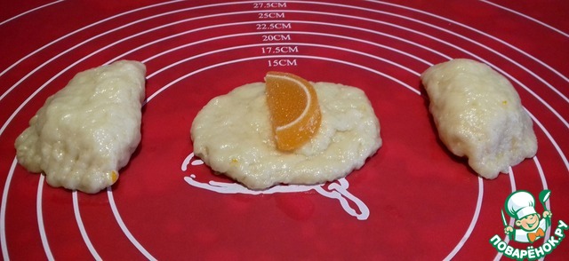 Тесто разделить на кусочки, скатать шарики немного больше грецкого ореха (ориентируйтесь по размеру мармелада). Расплющить каждый шарик в лепешку, положить мармелад, соединить края, как на вареник, и вилкой прижать эти края. На фото видны эти три стадии.