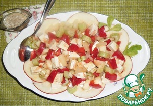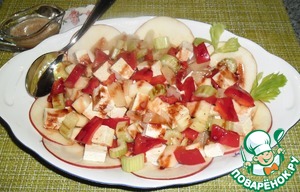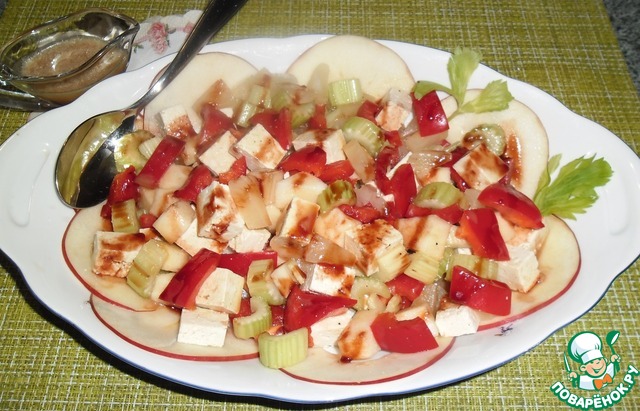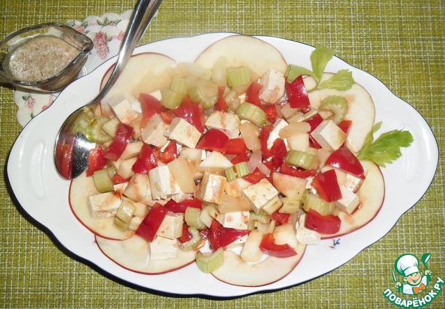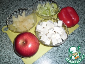Помыть, обсушить яблоко, сельдерей, перец, с Тофу слить рассол, обсушить. ЯБЛОКО очистить от кожуры, сельдерей освободить от прожилок. Всё нарезать кубиками, размер на Ваш вкус.