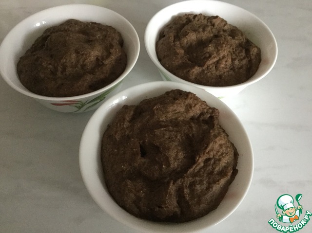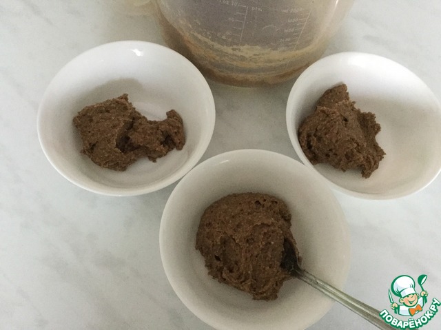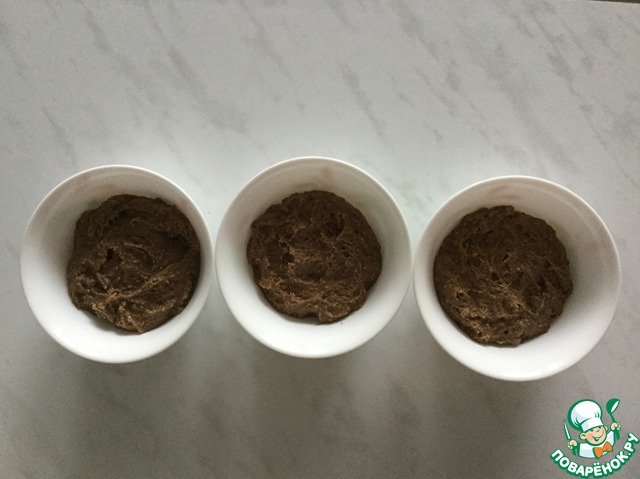 Пробую разделить его поровну на три салатника... я решила смазать их немного растительным маслом (взяла кукурузное).