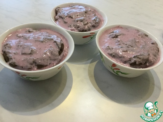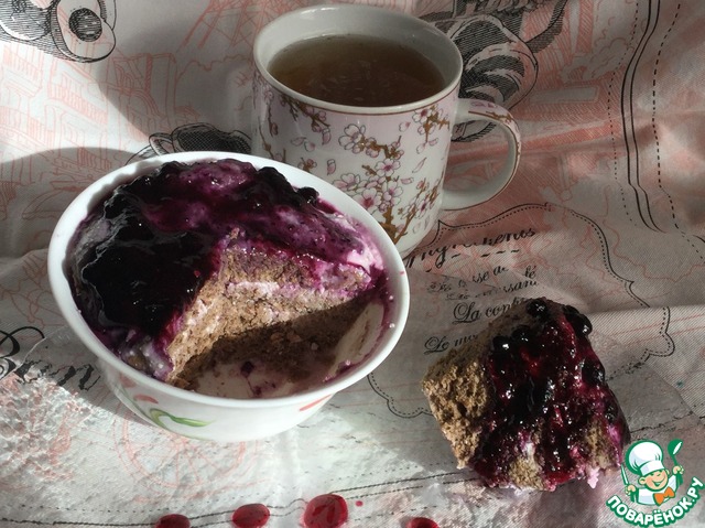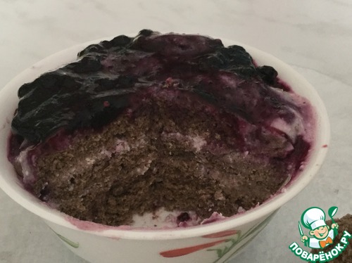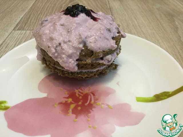 Что делать с готовыми кексами дальше - дело каждого. Если вы любите не очень пропитанную выпечку, то можно полить любимым соусом и пробовать. Я сделала так: смешала творог с черничным питьевым йогуртом и пропитала хорошенько все слои. Теперь убираю их в холодильник, чтобы на завтрак отведать это лакомство, так как мы предпочитаем хорошо пропитанную выпечку.