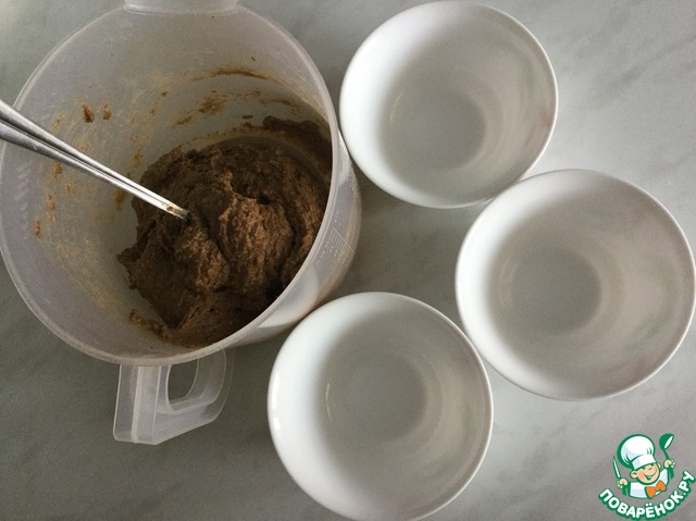 Для этого десерта мне хотелось найти посуду, у которой дно не намного уже остальной формы. Но так как мои глубокие кружки не обладают этими характеристиками, то пришлось взять маленькие салатники и замешивать тесто в одной большой емкости. Если у вас с этим нет проблем, то можно (даже нужно, так как получится точно все поровну...) в каждой ёмкости для выпекания замесить тесто. Сначала смешиваю все сухие компоненты, потом добавляю яйца и молоко.