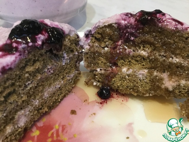 Убирать до завтра его уже не стала. Налила немного вишнёвого сиропа на тарелку, положила нижний корж, смазала сверху тем самым творогом с черничным йогуртом, потом положила второй корж, немного пропитала сиропом и дальше повторила все тоже самое.
