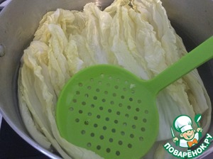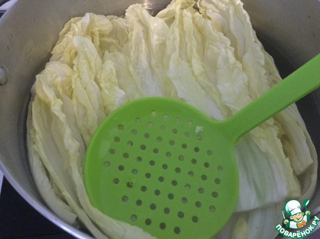 В подходящего размера кастрюлю наливаю воду, кипячу ее, загружаю туда листы капусты и отвариваю 2 минуты.