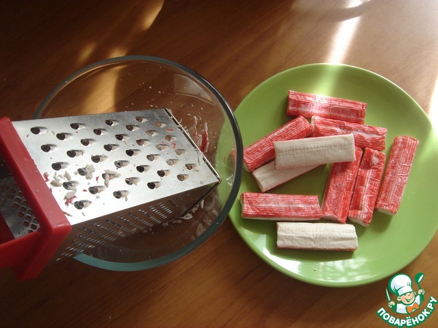 • Чтобы крабовые палочки хорошо натёрлись на тёрке, их нужно немного заморозить. Натираем палочки на тёрке средней.