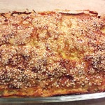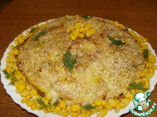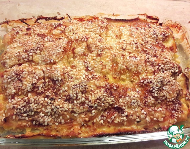 3. На смазанную маслом форму выложить в один слой филе, обильно смазать яйцами, смешанными с горчицей и специями. Сверху распределить часть начинки. Потом опять слой филе, смазать яйцом и - начинка. Продолжать выкладывать, добавляя соль по вкусу. Последний слой - филе, смазанное яйцом. Посыпать кунжутом.