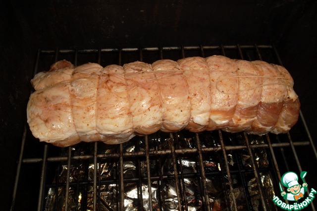 После посола извлекаем мясо из пленки, промываем от специй, подсушиваем бумажными полотенцами и перевязываем, как показано на фото. Можно использовать формовочную сетку, если есть в хозяйстве. Желательно, перед копчением, подвесить мясо на пару часиков в прохладном помещении или на улице, накрыв марлей, что бы оно хорошенько подсохло...