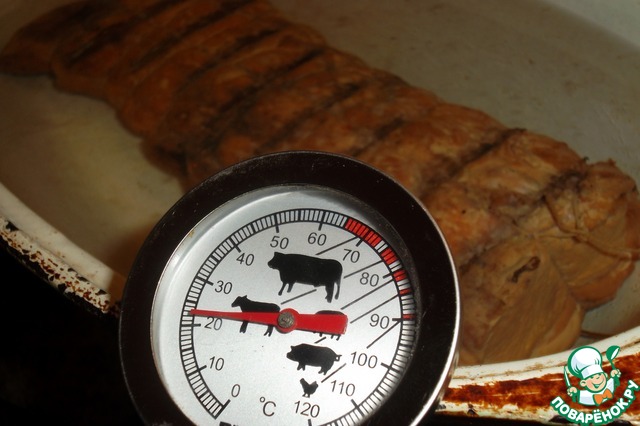 В подходящей посуде нагреваем воду до комнатной температуры, погружаем в нее мясо. Медленно доводим температуру до 73 градусов и варим мясо до достижения 68...70 градусов в средине куска. Для примера: варка заняла у меня в общем 1 час и 50 минут. От достижения воды 73 градусов и до окончания процесса - 40 минут.
