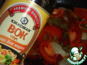 Добавить перец, помидоры, соевый соус ТМ Киккоман ВОК и прожарить пару минут.