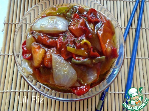 Помидоры, сладкий перец и лук тушатся в соусе, за счет него приобретают сладковато-соевый вкус.