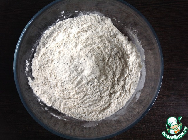В миску добавить муку, разрыхлитель, соль и мак. Хорошо перемешать. У меня стакан емкостью 240 мл.