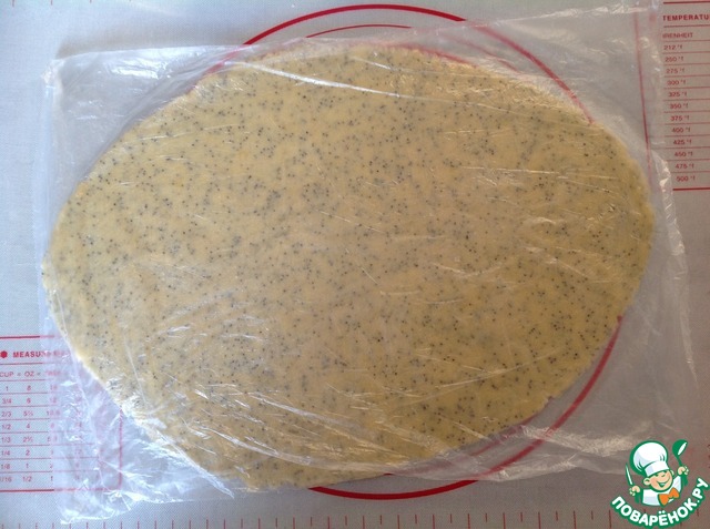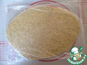 Рабочую поверхность застелить пергаментной бумагой или полиэтиленовой пленкой. Выложить тесто. Поверх теста положить другой лист пергамента или полиэтиленовой пленки и раскатать в пласт до толщины теста 6-7 мм.
