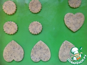 Вырезать из теста печенье при помощи формочек или стаканом. Переложить печенье на подготовленные противни.