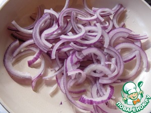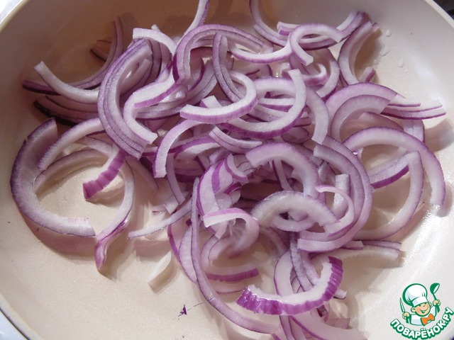• Красный лук нарезать полукольцами, обжарить на растительном масле 1- 2 минуты.