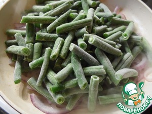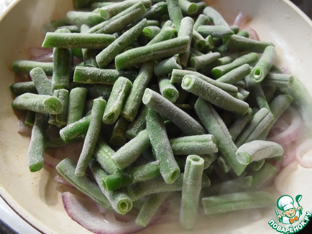 Стручковую фасоль (не размораживая) добавить к луку, обжарить, помешивая, 4-5 минут.