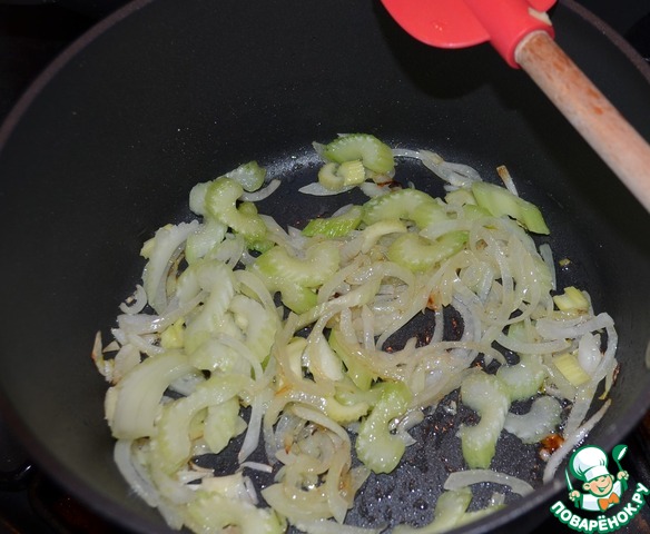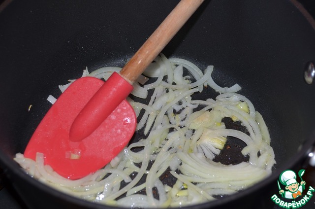 Лук нарезать полукольцами, обжарить на растительном масле.