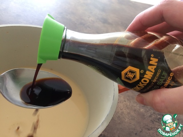 В получившуюся массу добавить 1 ложку соевого соуса "Киккоман". У меня легкий, поэтому не очень соленый. Если используете классический, то соуса нужно меньше.