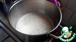 Выливаем опару в большую ёмкость или кастрюлю (у меня это 10-литровая кастрюля из нержавеющей стали), т. к. теста получается много и ему ещё придётся подходить.