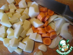Картофель, морковь и лук чистим и режем произвольно. Зубчики чеснока раздавим ножом.