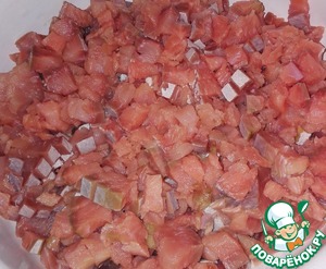 Порезать филе мелким кубиком (1х1см).