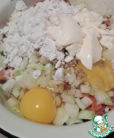 Добавляем к нашей рыбке лук и все остальное: яйца, манную крупу, майонез, крахмал, соль, перец.