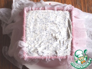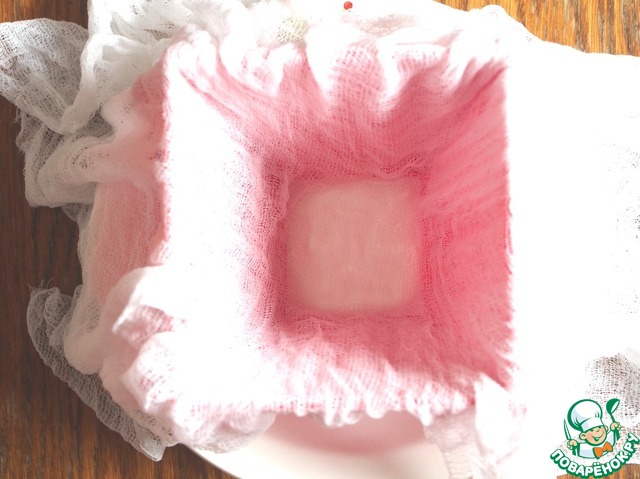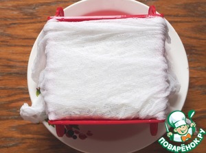 Накрываем концами марли. Сверху поставить небольшой груз. Я поставила блюдце, а на него литровую банку с вареньем. Убрать в холодильник на сутки.