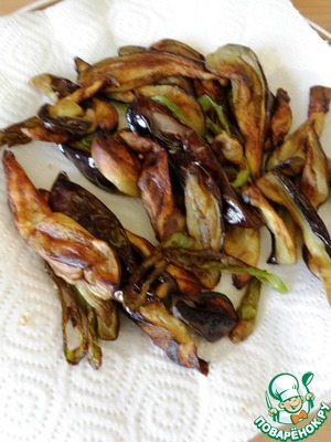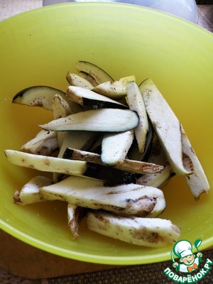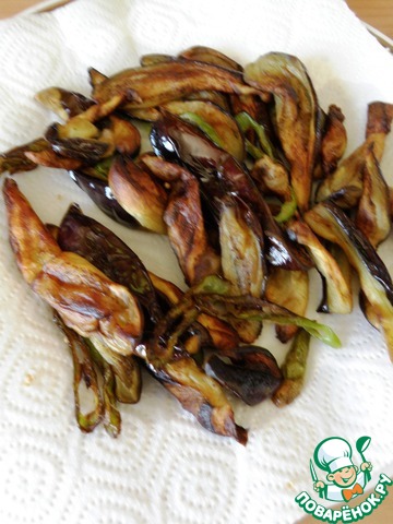 • Баклажаны нарезать крупными длинными ломтиками, посолить, выложить в дуршлаг и отставить на полчаса. Затем промыть, отжать и обсушить. Это делается не для того, чтобы убрать горечь - нынешние баклажаны давно не горькие, никакие, а чтобы баклажаны впитывали меньше масла.