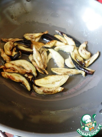 • Разогреть масло в глубокой сковороде и обжарить баклажаны до румянца. В середине обжарки добавить нарезанный перец.