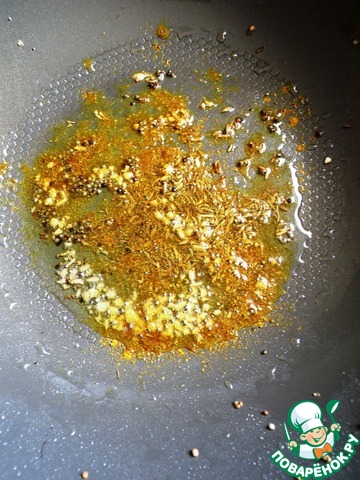 • Оставить на сковороде ложку масла, бросить семена горчицы и тмин с зирой, помешивать секунд 10. Осторожно – семена горчицы при перегреве могут стрелять во все стороны! Всыпать перец и куркуму, а затем добавить мелко рубленный имбирь. Все время помешивать.