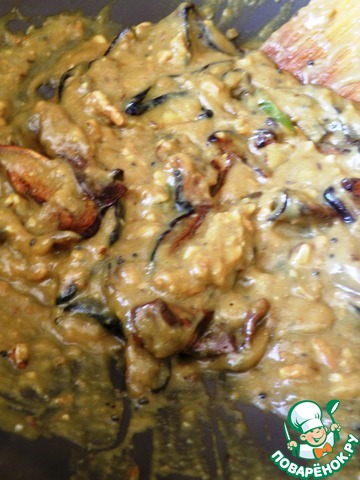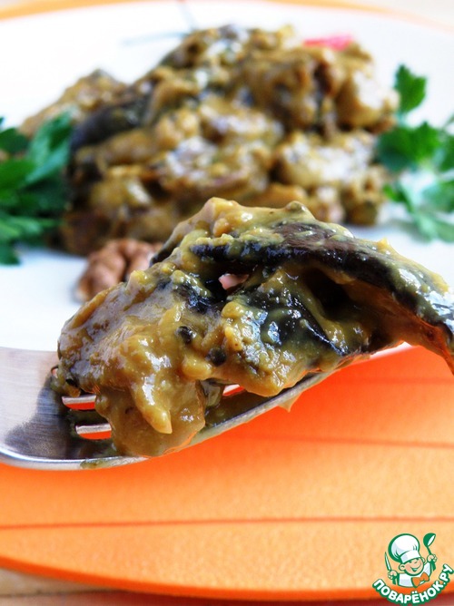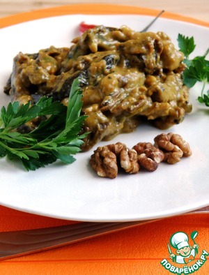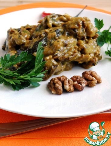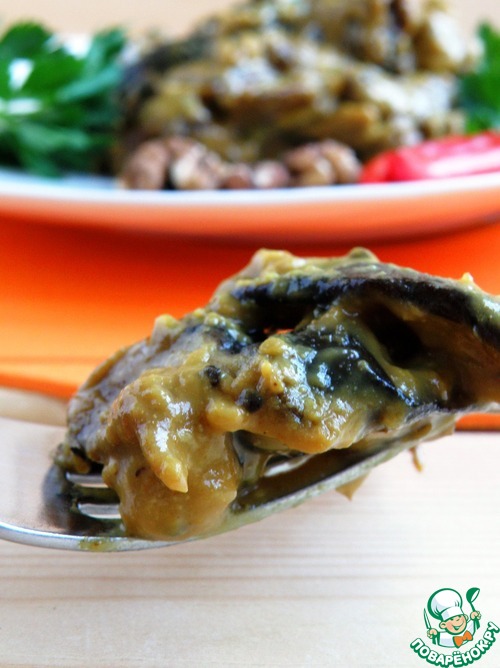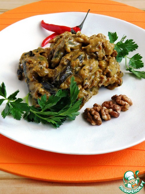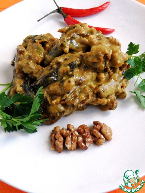 • Выложить баклажаны и перец, добавить дробленые грецкие орехи и прогреть все вместе еще пару минут.