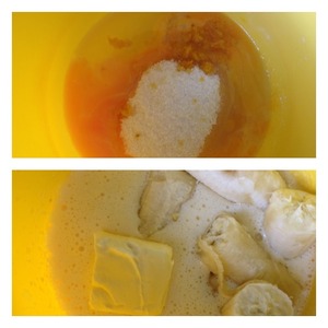 Яйца взбить с сахаром, ванилином и лимонной цедрой до белой пены. Добавить мягкое масло и поломанные на кусочки бананы. Лучше брать переспелые бананы и мягкие. Взбить миксером минуты 2, до однородного состояния.