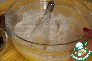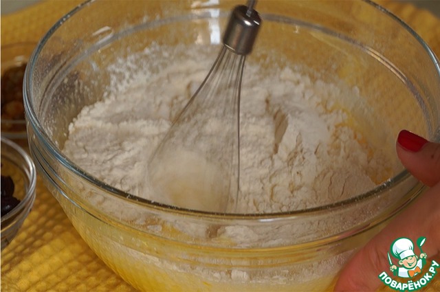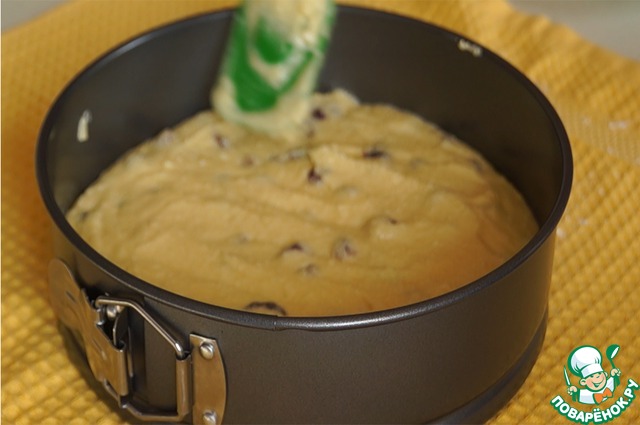 3. Всыпать сухофрукты, перемешать. Тесто перелить в форму, застеленную пергаментом и смазанную масло, выпекаем бисквит в разогретой до 180* духовке 35 - 40 минут. Готовый бисквит охладить.