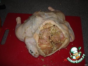 Аккуратно руками делаем мешок между кожей и мясом на курице, ножках, крылышках, спинке и грудке. Распихиваем туда пасту, обмазываем внутри, можно снаружи и зашиваем или завязываем. Ничего не боимся порвать.