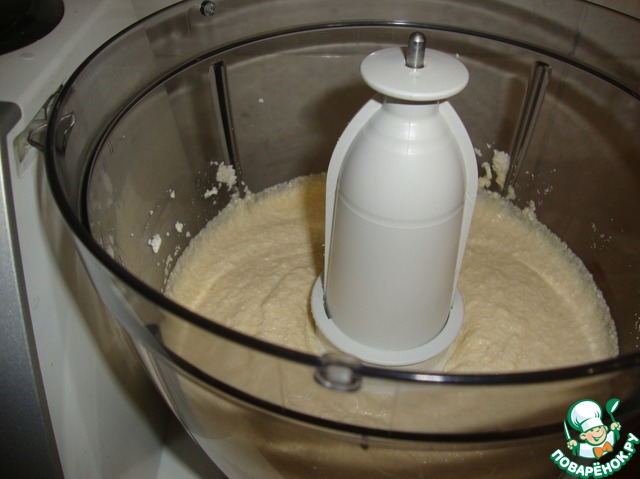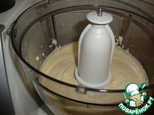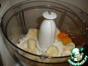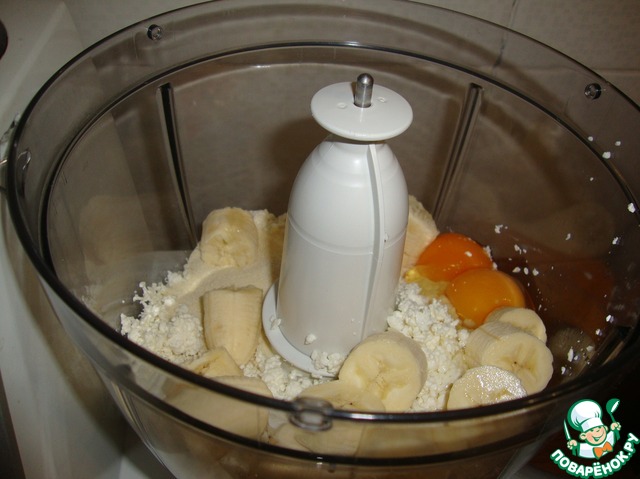Творог, яйца, манную крупу, бананы и сахар положить в чашу комбайна.