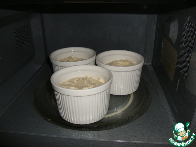 Поставить в микроволновку на 5-6 минут. Время приготовления зависит от размера формочек и мощности МВ.