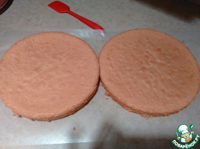 Достаем форму из морозилку и не забываем про пергамент. Выливаем наше тесто в две формы (первый раз у меня была только одна форма, я делала тесто в два подхода. Сначала половину ингредиентов, когда спекся бисквит дала ему постоять 10 мин, отделилась от формы, достала, помыла, вытерла насухо и в морозилку. Потом сделала вторую половину теста и спекла). Ставим в разогретую духовку на 180' на 23_25 мин. Не передержите! Освобождаем от формы, слегка поддев края лопаткой или ножом. Даем остыть минимум час, так как бисквит очень нежный.