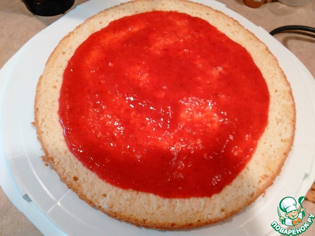 Теперь самая важная часть. Бисквит кладем на предпочитаемую посуду, в которой будем подавать торт. Смазываем клубничным пюре, но не до краев! Важно, чтобы потом получились красивые бока.