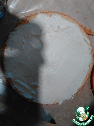 На второй бисквит выкладываем немного крема, и ровно распределяем, до краев.