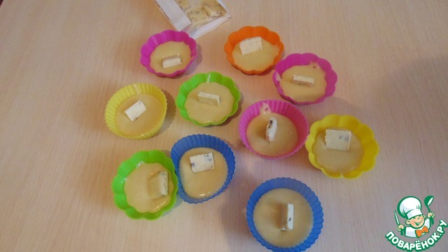 Наполняем формочки тестом на 1/2, кладем по кусочку шоколадки в каждую форму (можно выбрать любой шоколад по вкусу)