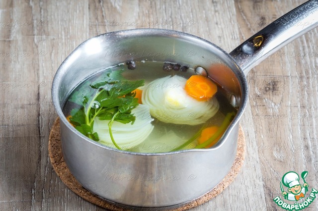 Первым делом необходимо поставить вариться бульон. Лук чистим и разрезаем пополам, сельдерей режим тоже на две половины, морковь толстыми слайсами, зелень моем. В сотейник наливаем воду, кладем подготовленные овощи и ставим на большой огонь. Когда вода закипит, солим, добавляем душистый перец, уменьшаем огонь до легкого бурления и оставляем бульон вариться около 30 минут. Он должен получится довольно соленым инасыщеным, так как часть соли при подаче вберет в себя фунчоза