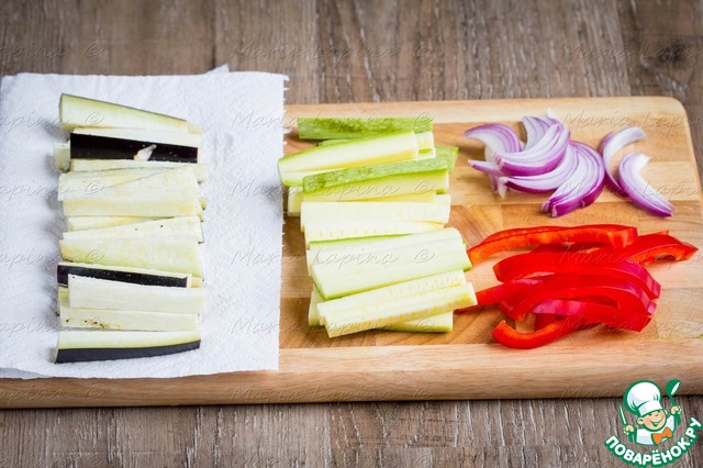 Подготовим овощи для запекания. Баклажан нарезаем брусочками, кладем на бумажное полотенце и присаливаем. Кабачок режем брусочками, лук и перец полукольцами или перьями.