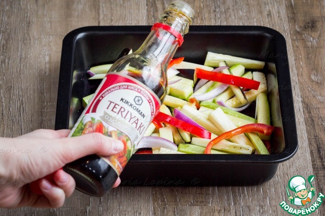 Вытираем выступившую влагу на баклажане, складываем все овощи в форму или на противень. Сбрызгиваем оливковым маслом и соусом терияки. Ставим в духовку при 180 С на 15 минут, затем увеличиваем до 220, включаем гриль и держим ещё 5 минут в духовки для образования румянца.