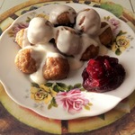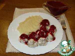 Все готово! Подают тефтельки обычно, полив брусничным соусом, с пюре или просто с вареным картофелем.