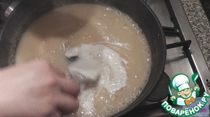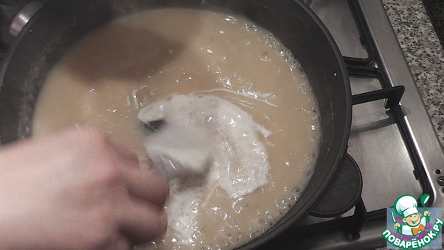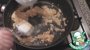 А пока делаем соус. Растапливаем сливочное масло на сковороде. Постепенно всыпаем муку, помешивая, чтобы не было комочков. От степени обжарки муки зависит цвет соуса. Вливаем постепенно бульон, так же помешивая.