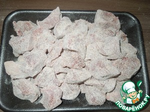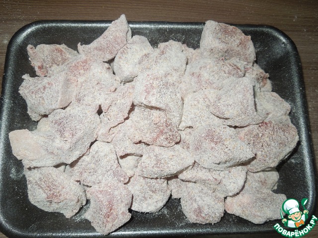 Мясо нарезать кусочками и обвалять в муке. Если нравится густая подливка, то лучше заменить цельнозерновую муку обычной.