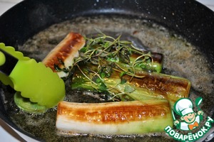 Разрезаем лук-порей на четыре части, обжариваем его на оливковом и постном сливочном масле с обеих сторон по несколько минут, несколько веточек тимьяна придадут блюду особый аромат! Под конец жарки добавляем соевый соус "Kikkoman". Готовый порей выкладываем на тарелку.