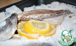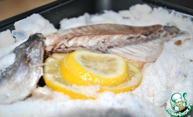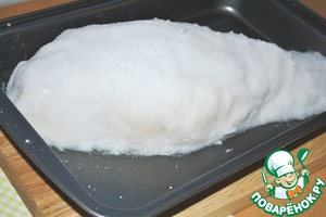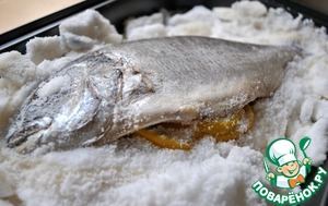 На дно формы выкладываем толстый слой соли, затем кладем рыбу и формируем еще слой сверху, затем по бокам и так пока вся рыба не будет в соли. Не переживайте, что испортите Дорадо столь большим количеством соли, наоборот, она будет в меру соленая, с легкой кислинкой. Отправляем рыбу в предварительно разогретую духовку на 25 минут.