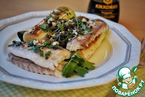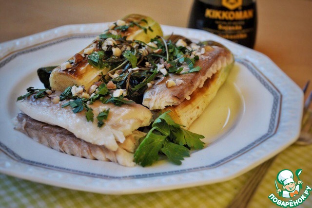 Выкладываем филе Дорадо на тарелку к луку-порей, посыпаем рубленной петрушкой и поджаренными орешками. Наша рыбка готова! Приятного аппетита!
