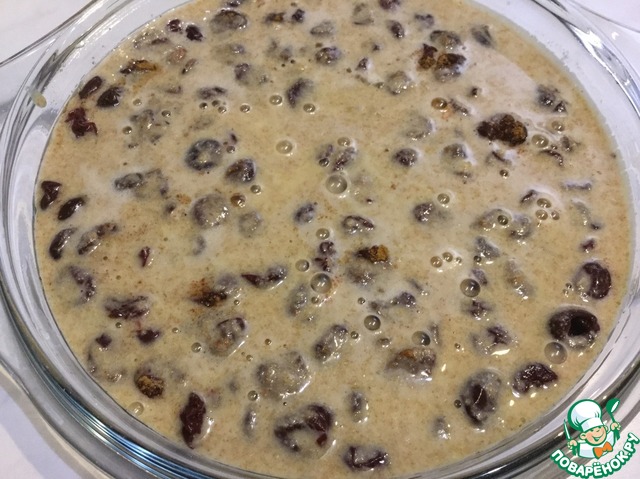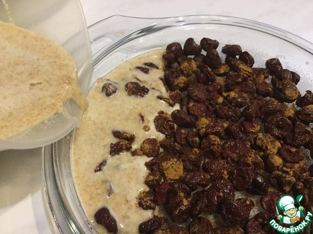 Положила слой вишни (посыпала корицей... люблю её) и начала заливать тестом, постоявшим в сторонке отведённое время.
