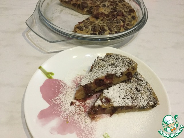 Клафути получился плотненьким и сочным, режется очень хорошо. Единственное, я бы смешала вишню с сахаром или с сахарной пудрой. Опять же, потому что она замороженная, думаю со свежей, если она не очень кислая, этого не надо будет делать. Но это легко исправить, посыпав той же пудрой или полив любым соусом.